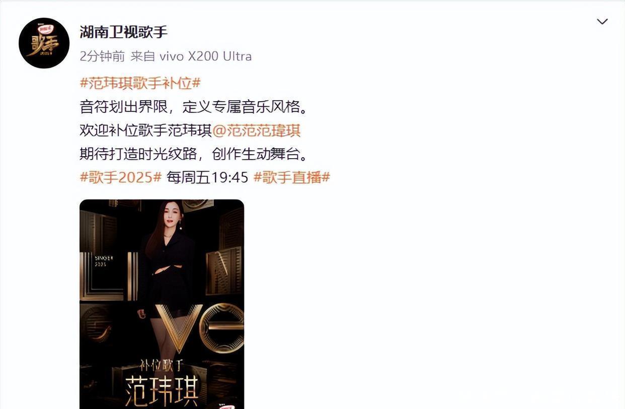 《歌手2025》第四期初次接收双补位“生血战”,两位补位歌手需进行1v1对决,胜者精良补位,败者径直淘汰且失去解围赛经历。此前,歌手卫兰已通过节目组官方账号官宣补位。